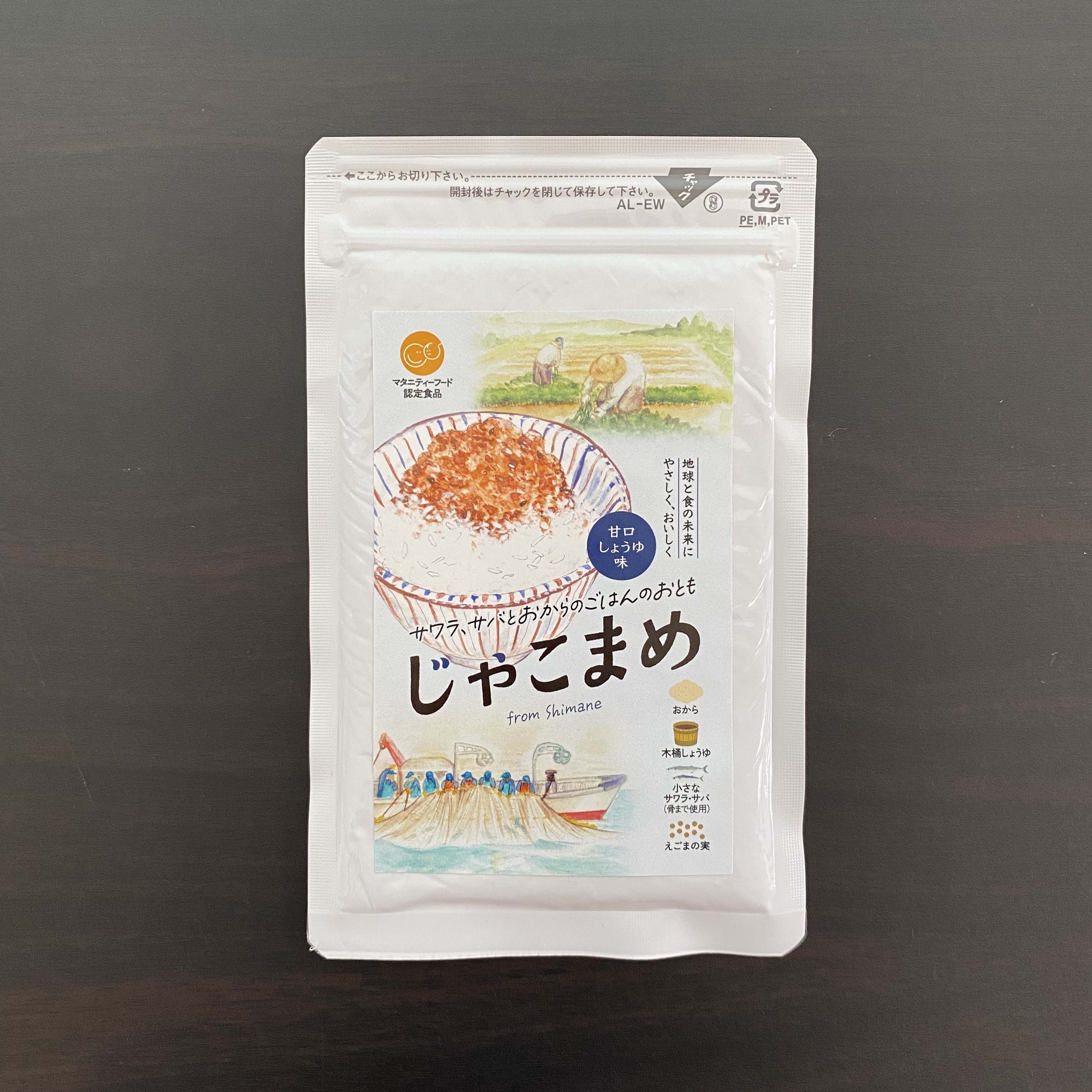 「じゃこまめ」は、島根県の新鮮な魚とおからを使用したソフトふりかけです。規格外のサイズで低利用魚扱いとなるサバ・サワラと、食用での利用範囲が限られる地元のおからを有効に活用し、SDGsへの貢献を目指して開発しました。お魚は骨まで粉砕して使用しています。